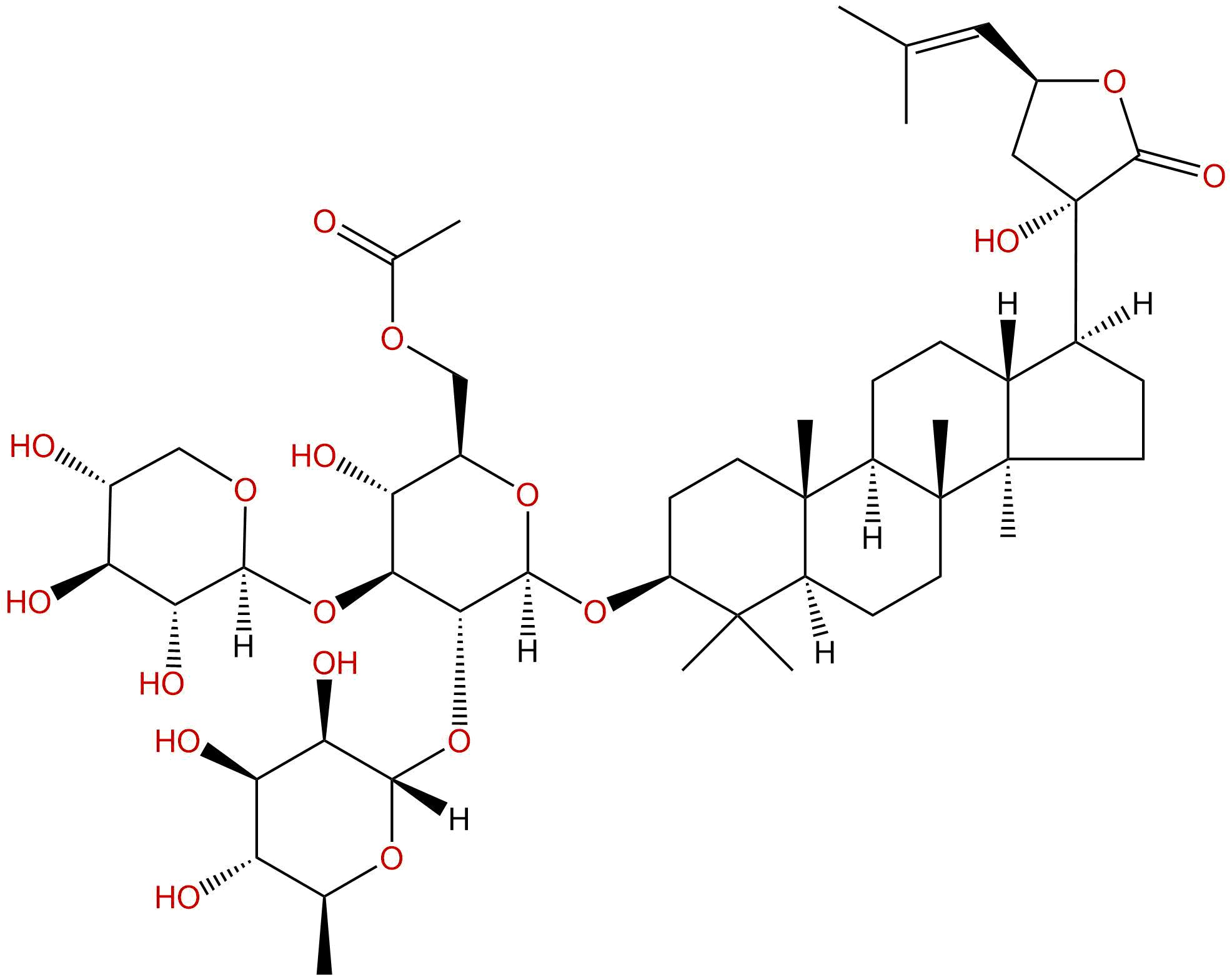 英文别名: (3β,20S,23S)-3,20,23-trihydroxydammar-24-en-21-oic acid-21,23-lactone 3-O-[α-L-rhamnopyranosyl-(1-2)]-[β-D-xylopyranosyl-(1-3)]-β-D-6-O-acetylglucopyranoside